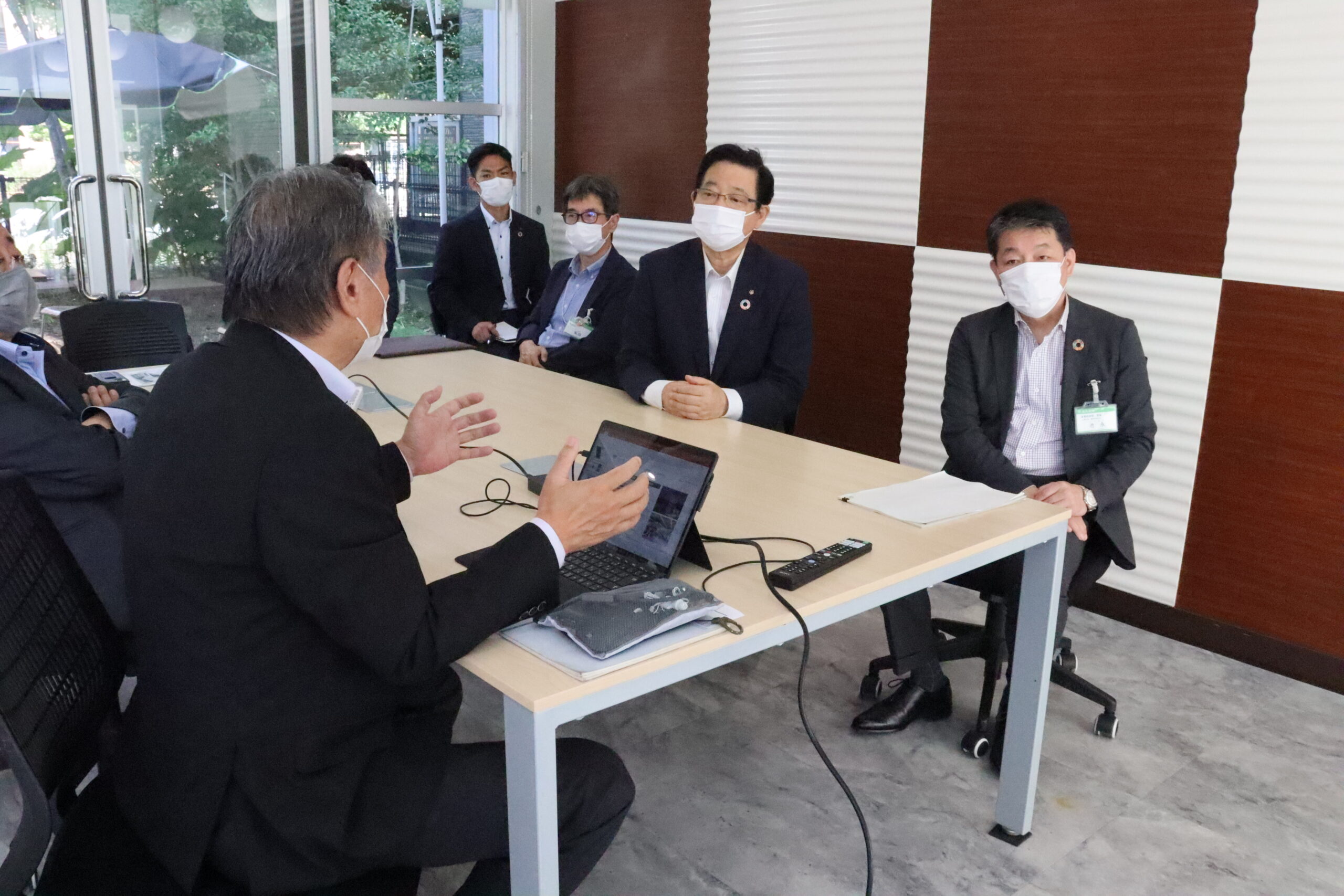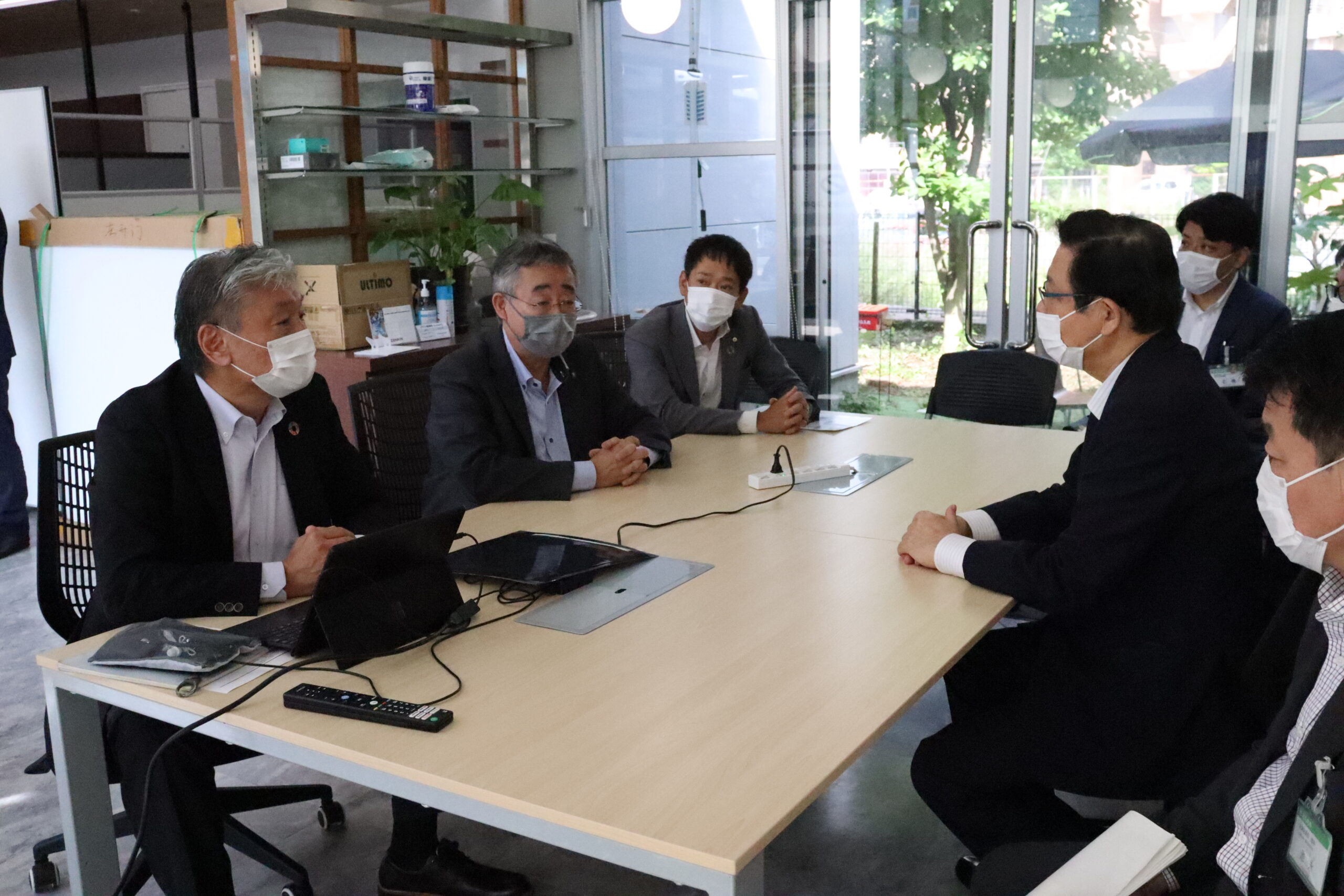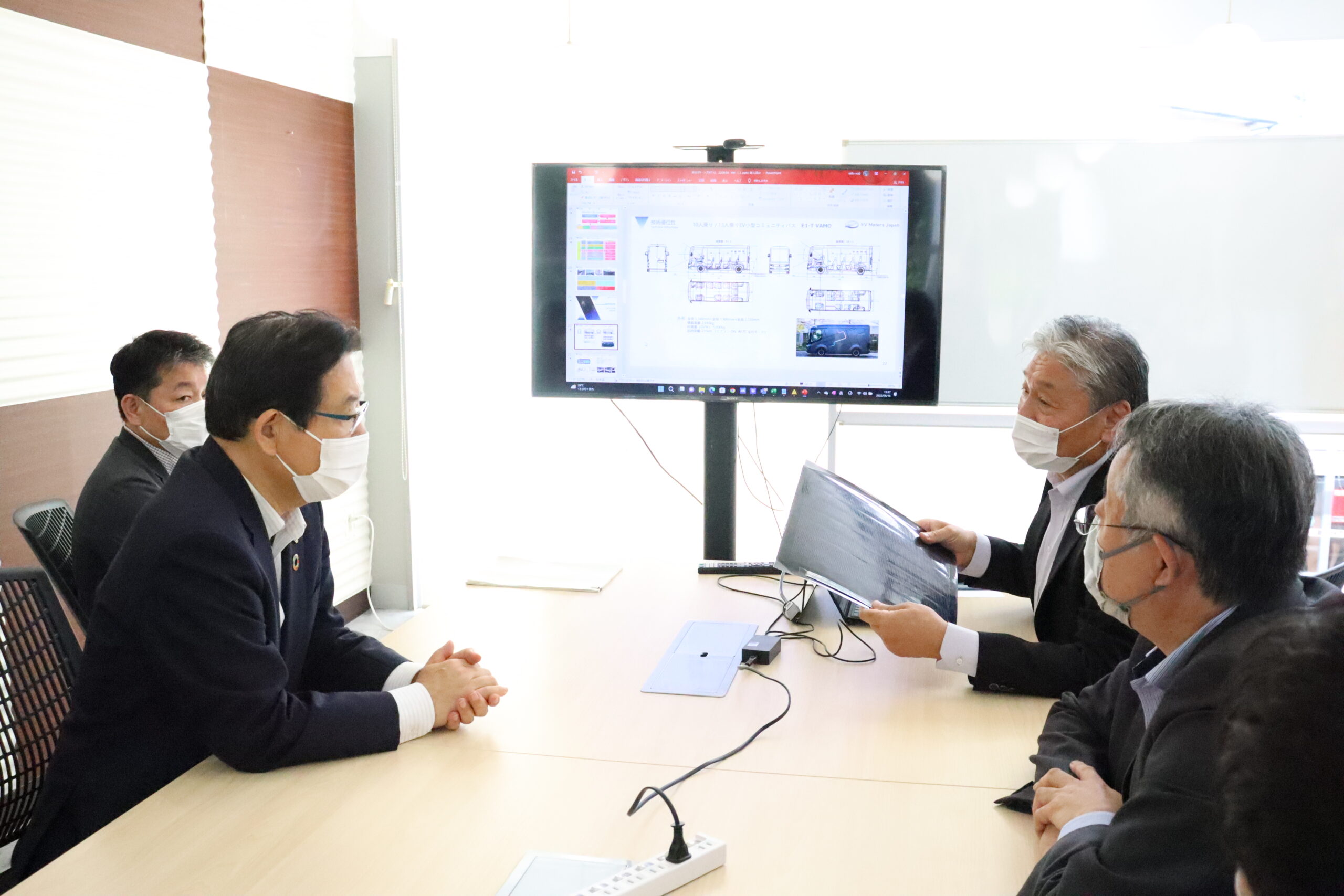 2022年6月16日に、北橋北九州市長様、第一交通産業株式会社 代表取締役社長 田中 亮一郎様にご来社いただき、改めて弊社の事業のご紹介や商用EV組み立て工場建設に関する意見交換会を行いました。