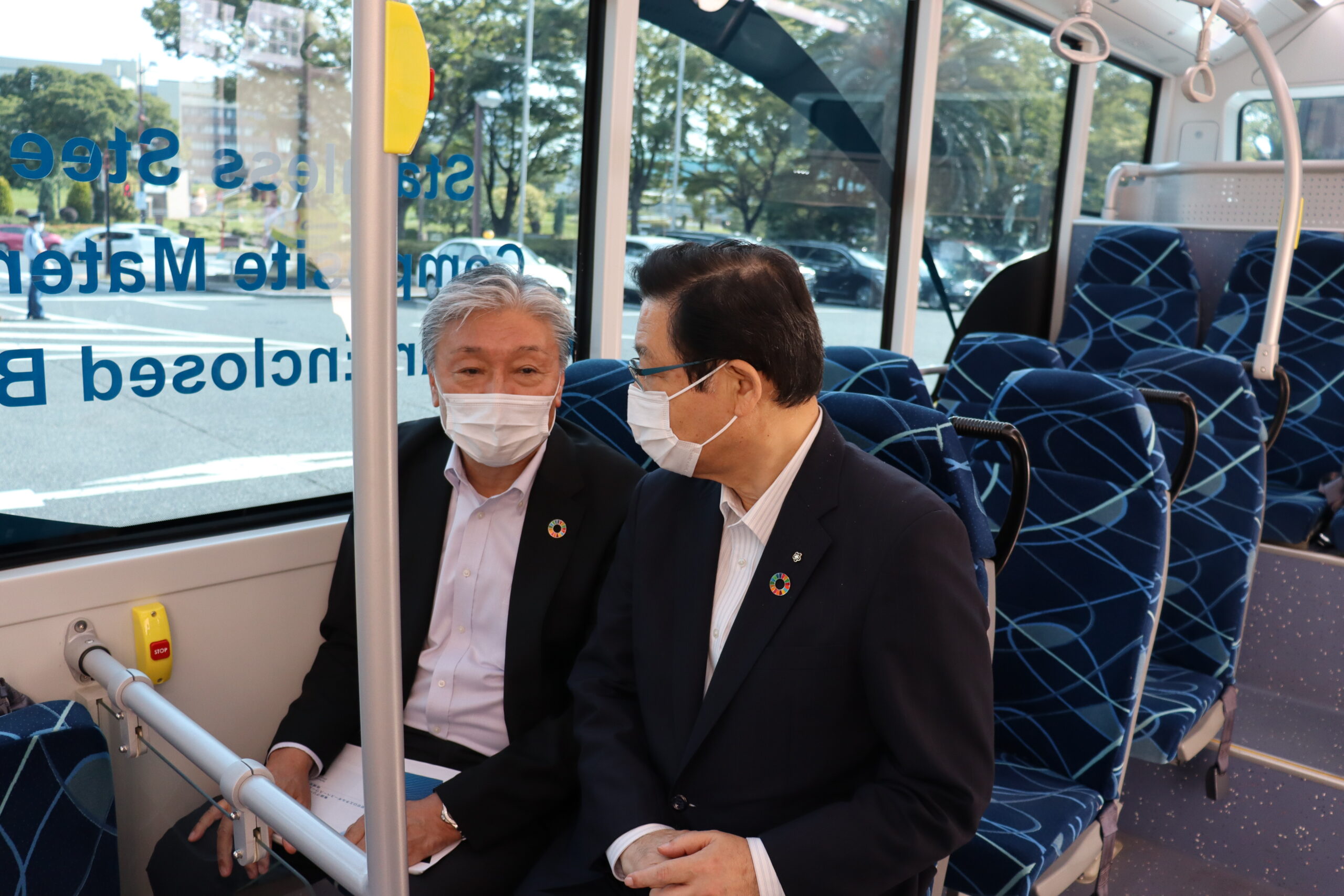 その後、小型コミュニティEVバスへ乗車し、北九州市役所へ移動。