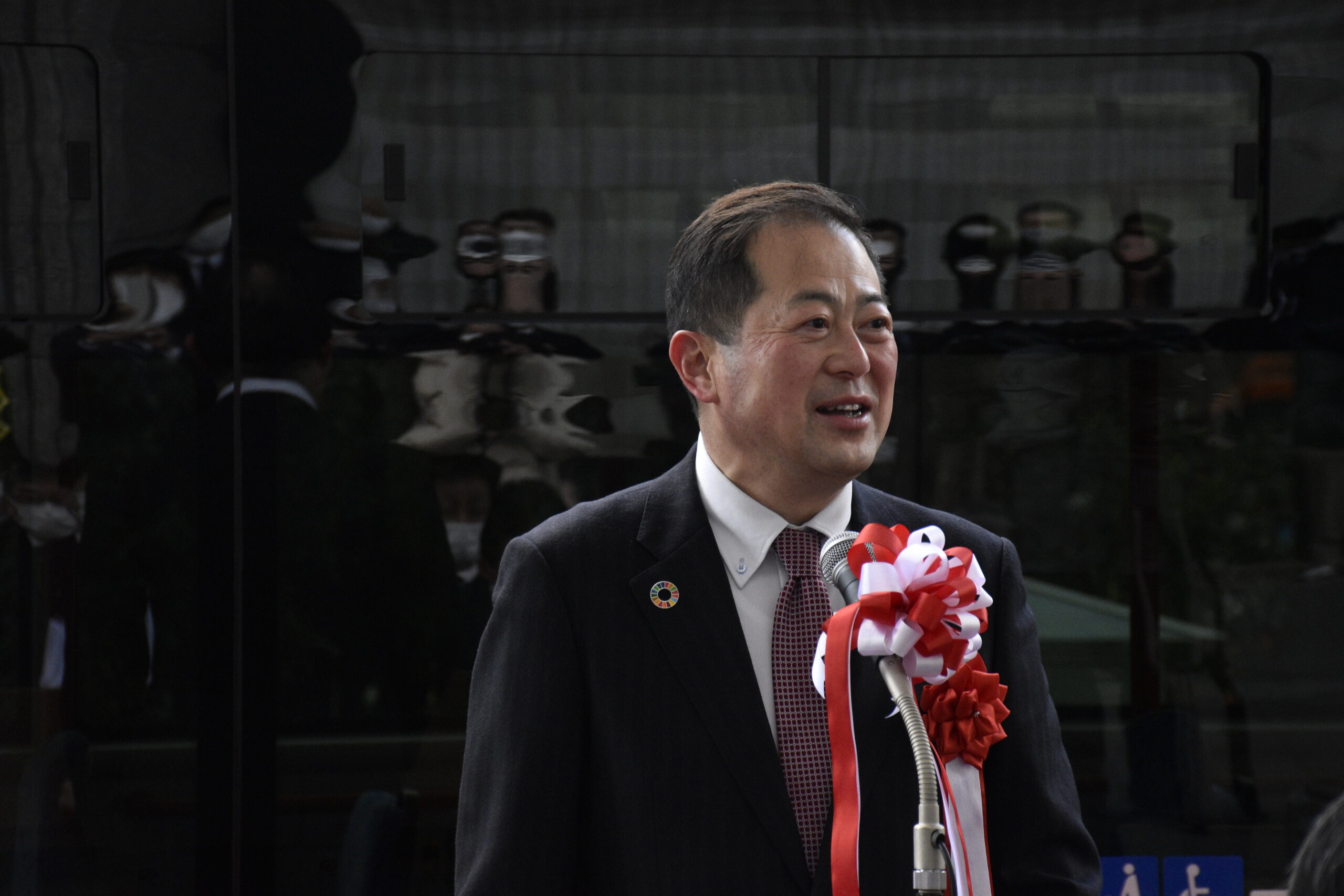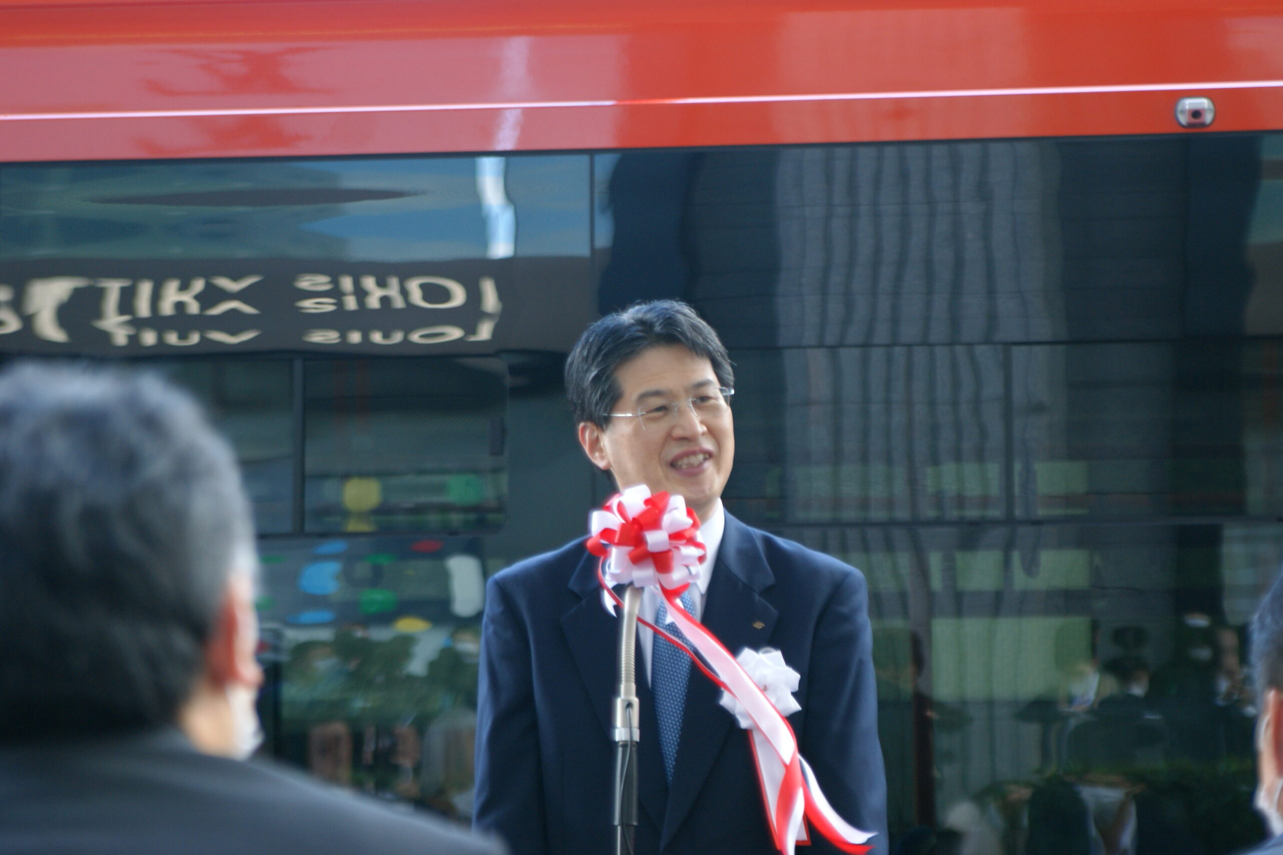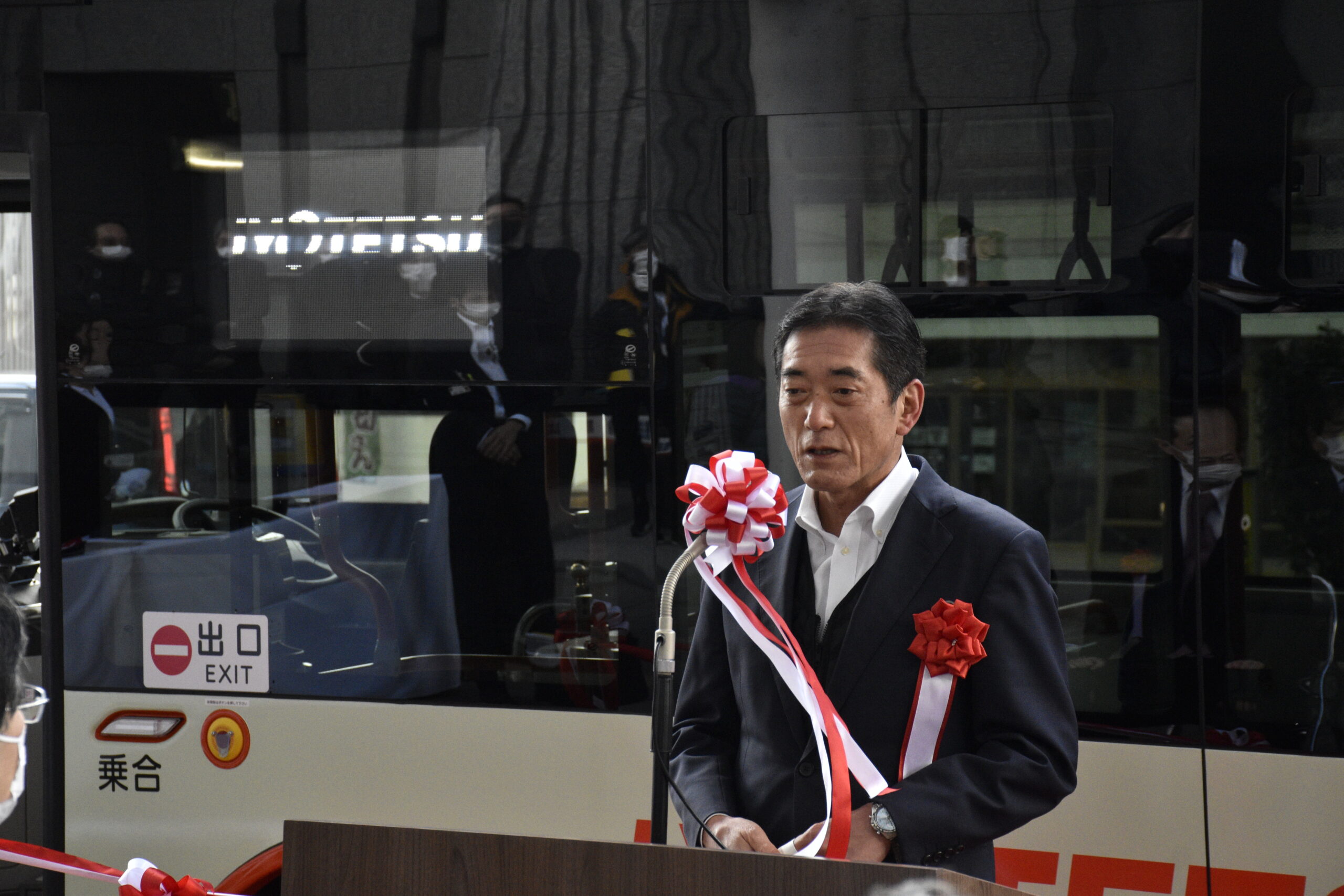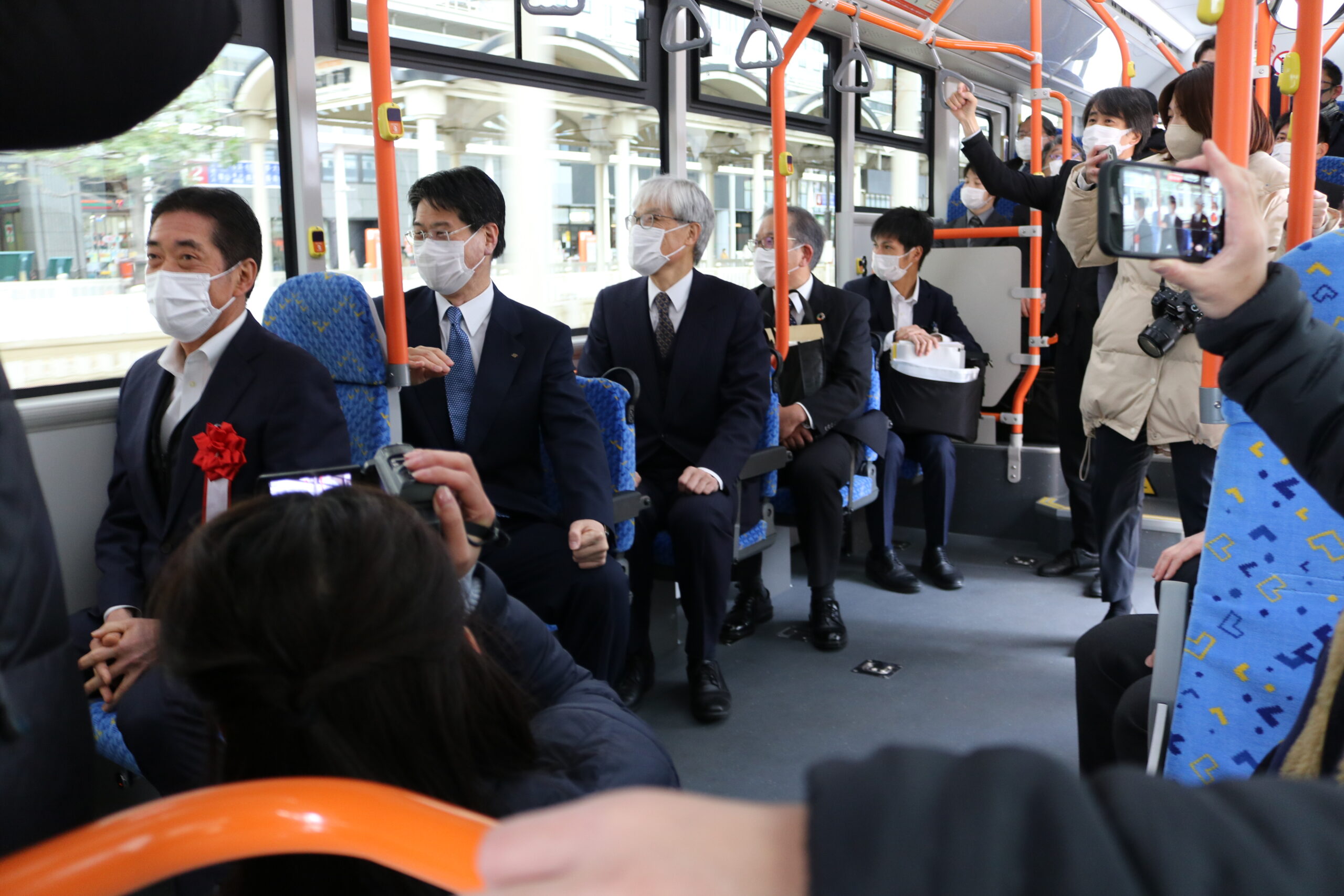 なお、当日は御来賓に、国土交通事務次官 藤井 直樹 様、四国運輸局長 吉元 博文 様 、愛媛県知事 中村 時広 様 、松山市長 野志 克仁 様 がお越しくださり、弊社が納車しました大型EV路線バスに試乗いただきました。