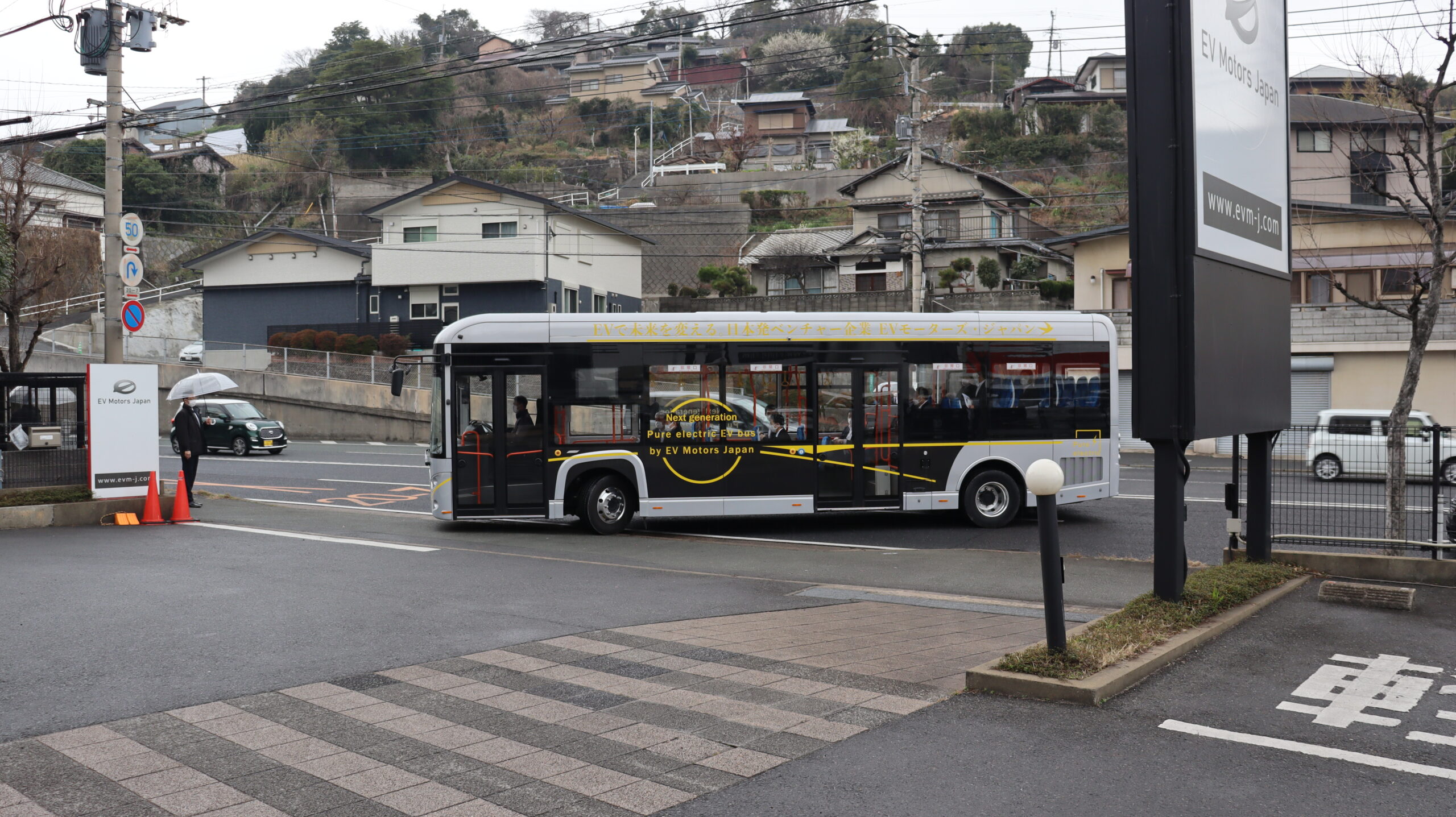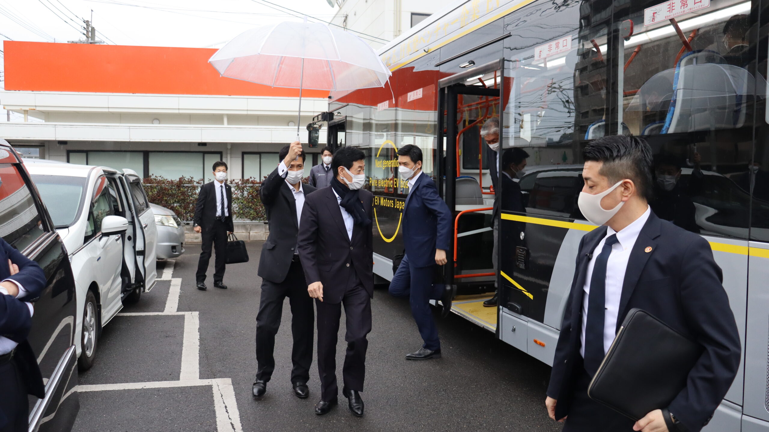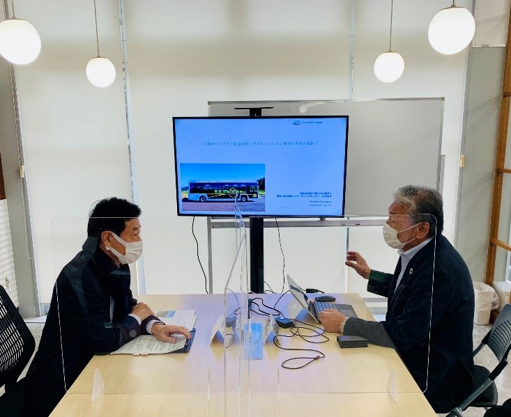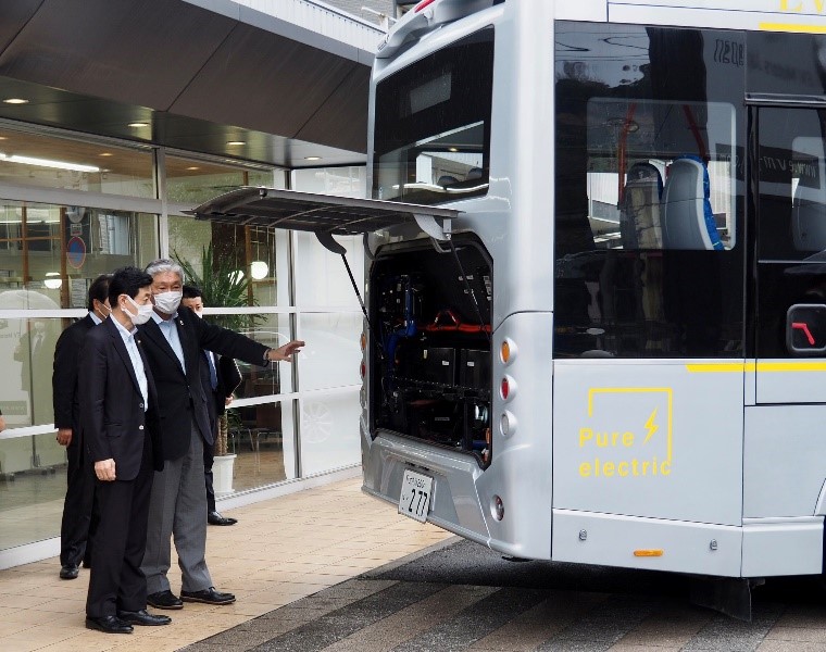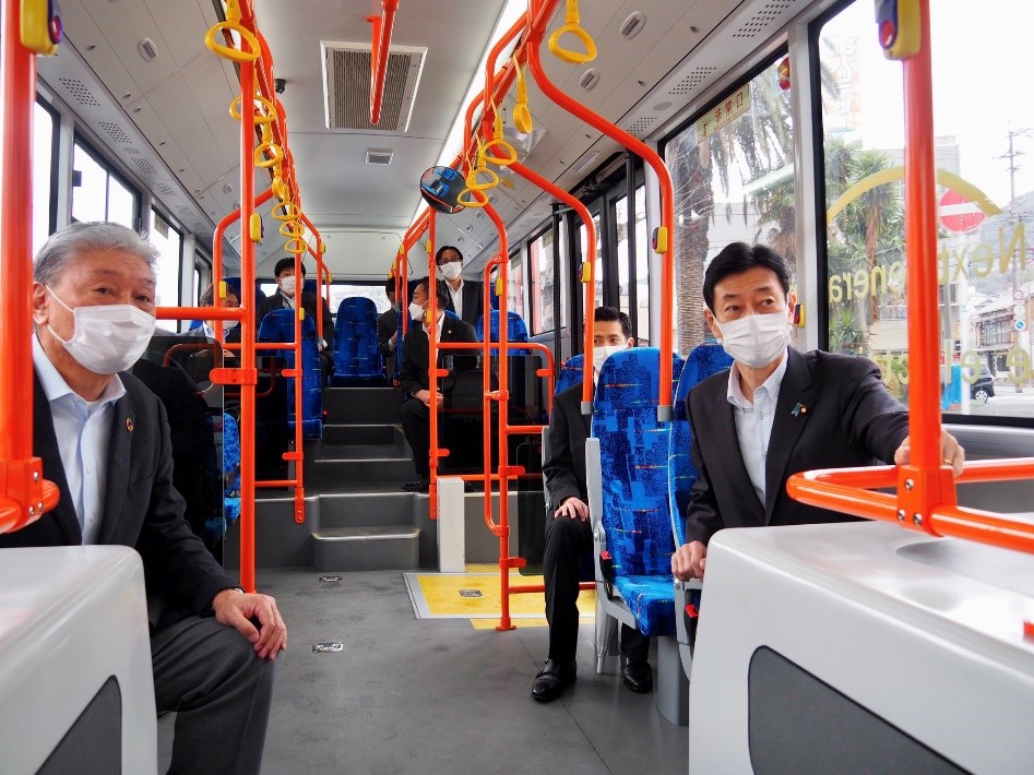 当日は、弊社の事業内容や2023年に北九州に建設する商用EV組み立て工場について意見交換をさせていただきました。その後、10.5mサイズのEV路線バスに試乗いただきました。